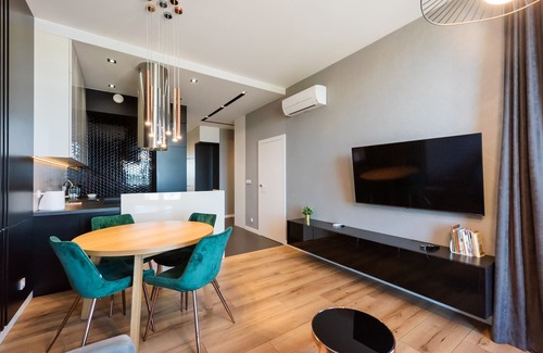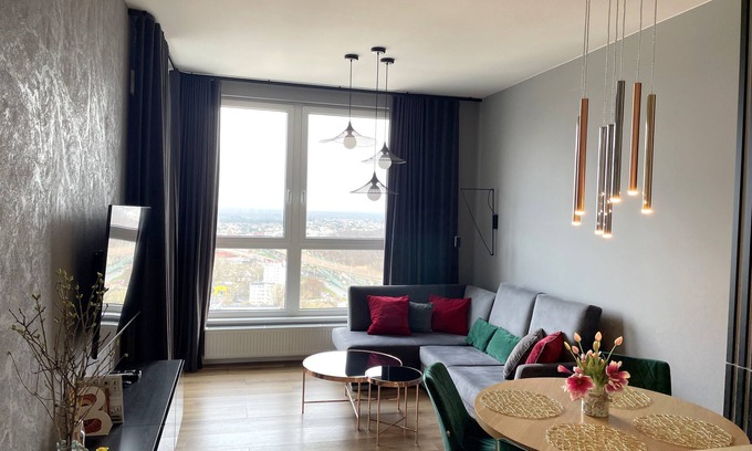Praga 23rd Floor High-Class Apartment is located on the 23rd floor in a modern building in Praga Południe. The flat offers a magnificent view of the green districts of Warsaw.