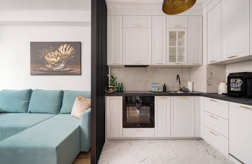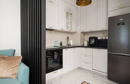 Praga Komorska Delightful Apartment features a stylishly decorated living room with a fold-out sofa and kitchenette, a bedroom with a comfortable double bed, a bathroom, and a spacious balcony where guests can relax with a morning coffee or an evening glass of wine. Guests have access to a wide range of practical amenities, including free Wi-Fi, a TV, a washing machine, an iron, a hairdryer, a fridge with freezer, a dishwasher, an oven, an electric kettle, a microwave, an induction cooktop, and kitchenware.