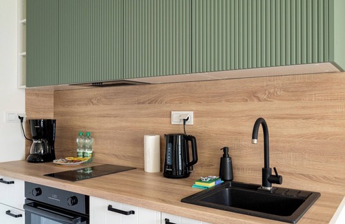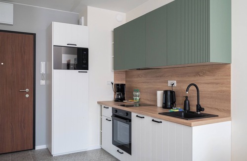 Praga Południe 2-Bedroom Apartment features a cozy living room with a sofa bed and a kitchenette, two separate bedrooms (one with a single bed, the other with a comfortable double bed), a bathroom, and a balcony where guests can relax and enjoy their morning coffee or evening wine. Guests have access to a range of practical amenities, including free WiFi, cable TV, a washing machine, an iron, a hairdryer, a refrigerator with a freezer, a dishwasher, an induction stove, an oven, a drip coffee maker, a microwave, and kitchen accessories. Guests also have a parking space available in the underground garage.