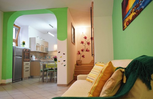 The apartment is on two levels. On the ground floor there is a large living area with a TV and a sofa bed, an equipped kitchen with a dining area and a small service bathroom also equipped with a washing machine. On the first floor, on the other hand, there are the two bedrooms (one double and one with twin beds) and the bathroom with shower. The house also has an internet connection via wi-fi and air conditioning systems.