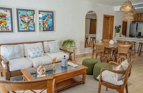 Located in the exclusive residential resort of GREEN ONE, PLAYA DORADA within one of the main tourist destinations of the Dominican Republic, and the prestigious and unique golf course in the area, enjoy what this 2-bedroom townhome has to offer. With a king bed, full bed, and bunk bed, guests can relax comfortably. The property includes amenities like a hair dryer, washing machine, Wi-Fi, AC, and iron. Also, you will have a private Pool & Patio with a huge Golf View.