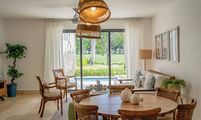 This unique villa has an impressive golf view & green area, the first bedroom with 1 king bed & the second bedroom with 1 Queen beds + 1 bunk bed, air conditioning, 2 bathrooms equipped with a shower and hair dryer, Smart TV, Wi-Fi, private mini pool & furnished backyard, a stylish living room area and a fully equipped kitchen. This private terrace, picuzzi and green areas will make you fall in love of a Playa Dorada experience. Special discounts for GOLF EXPERIENCE available.