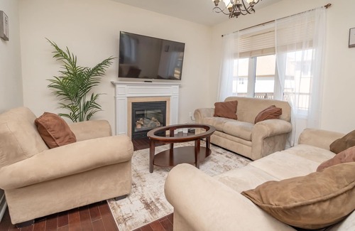 The main floor of our home features a large living room with a 65-inch smart TV (Netflix and Disney accounts provided), a fully equipped kitchen with a stove, fridge, microwave, and coffee maker, and a dining area. There is also a half bathroom on this level. The kitchen is stocked with all the essentials, including pots, pans, dishes, and utensils.