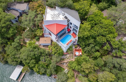 The Bluff House on Lake Austin has a swimming pool area overlooking Lake Austin with a large dock to swim off of with amenities such as a water slide, a boat slip, diving board, lake play pad to lay on and roped off shallow water area. It is about 20 minutes from downtown Austin. Property is very private with tremendous views up and down the Lake. Property is located by a very large park that has multiple trails for hiking. Great fishing off the dock also.