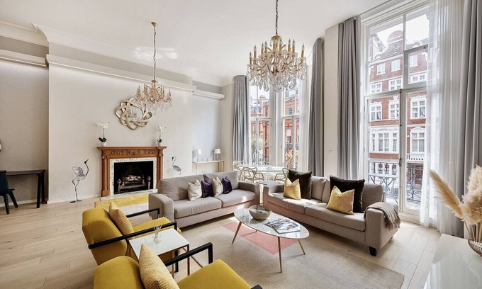 Presidential Residence | 14ft High Ceilings is located in Brompton & Hans Town. Presidential Residence | 14ft High Ceilings provides accommodation, featuring Balcony/Terrace, Bedding/Linens, Fireplace/Heating, among other amenities. This Apartment features Balcony/Terrace, Bedding/Linens, Fireplace/Heating, to make your stay a comfortable one.