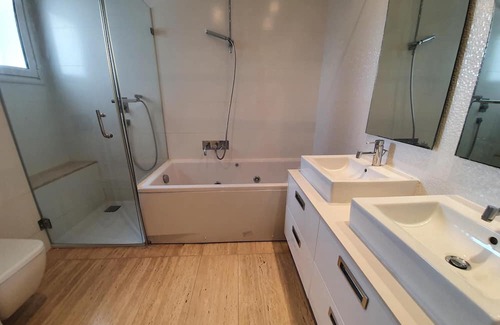 - A bathroom with jacuzzi bath, shower and double sink.