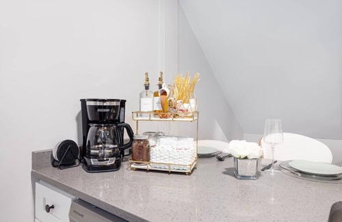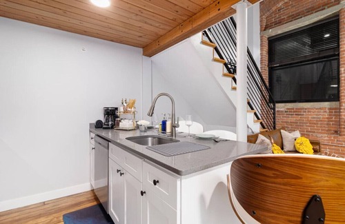 The modern kitchen is fully equipped with stainless steel appliances, perfect for crafting delicious meals. Enjoy the blend of old-world charm and contemporary comfort, making it an ideal stay for guests seeking a memorable Airbnb experience in Providence.