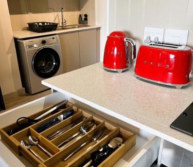 BathroomPrivate bathroom, Free toiletries, Body soap, Toilet paper, Toilet, Towels, Shower, Towels/Sheets (extra fee)Media & TechnologyTV, Streaming service (like Netflix), Flat-screen TVGeneralIroning facilities, Key access, Air conditioning, Key card access, IronOutdoorsOutdoor furniture, Balcony, BarbecueKitchenRefrigerator, Microwave, Kitchen, Electric kettle, Kitchenware, Dining table, Wine glasses, Stovetop, Oven, Toaster, Washing machineLiving AreaSofaBedroomLinensBuilding CharacteristicsPrivate apartment in buildingFood & DrinkBottle of waterRoom AmenitiesAdapter, Hypoallergenic pillow, Socket near the bedAccessibilityAccessible by elevatorPhysical distancingSingle-room AC for guest accommodation |