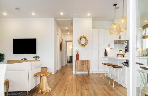 Gather in the sunlit and stylishly appointed living area to relax. It's the perfect spot to cool off in the central air-conditioning and stream your favorite channels on the large TV.