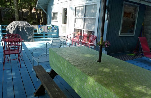 New guests will delight in the hard to find privacy, huge deck, incredible view, shoreside fire pit, boat dock and swim raft. We are happy to provide use of our canoe, WI-FI and washer. All the features and then some all in place as the basis for building treasured family memories. The surrounding wooded back lots are available to explore and provide a source to gather fire pit wood. Lots of space to hike and explore. The BIG Bass still hang out just off our dock. Past guests report having caught several .That's why the Loons and Great Blue Heron favor fishing there too. **** Please note this is a Saturday to Saturday week and you bring your own bedding, linens and towels. * Accomodation to this IF POSSIBLE for cost. PETS: 2 maximum @ $75./Wk/per pet.