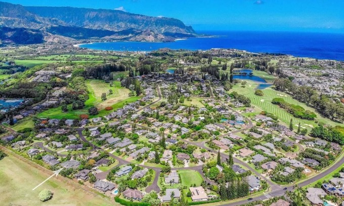 Behind the backyard is a walkway which runs along the perimeter of a large park. Beyond the park is a public library and the Princeville Shopping Mall, which includes restaurants, a grocery store, and convenience stores - all only a three-minute walk from the house. We are only a 10-minute walk to the pathway to Anini Beach.
