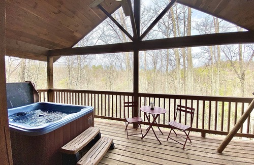 Turkey Feathers is a beautiful one bedroom, one bathroom cabin that is tucked away in the woods with seclusion and privacy perfect for a romantic getaway. The covered back deck with hot tub for two is perfect for every season relaxation.