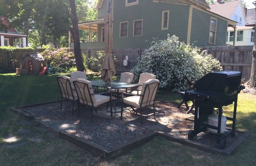 The spacious fenced-in backyard offers a private patio, along with plenty of space for entertaining. The outdoor entertainment area is complete with a propane grill and a patio table with umbrella, and seating for 6.