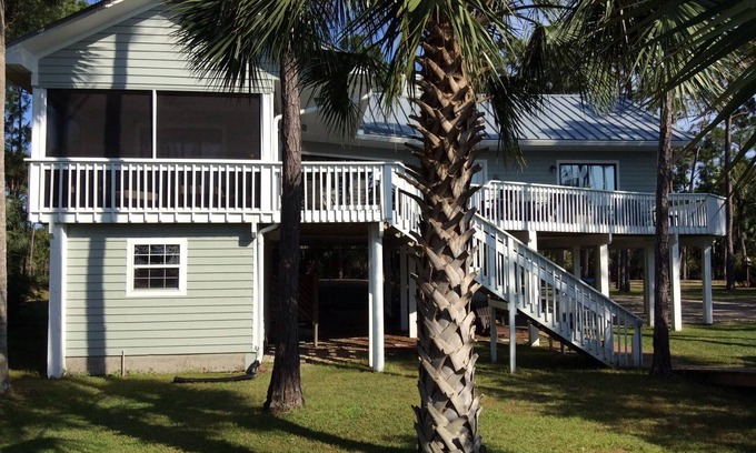 We directly overlook Apalachicola Bay from our wraparound deck and screened porch, with multiple sliding glass french doors offering views in every direction. Breathtaking sunsets! It has the best of both worlds - bayside views with cove fishing, but only a short stroll to the beach. When the ocean side waves are high, you can hear the pounding surf at our house.