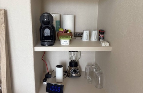 The optional separate casita has it’s own patio area, sun loungers and grill. That casita has a king size bed, full bathroom and kitchenette including a fridge, microwave, toaster oven, induction cooktop and all of the essentials you need to make some simple snacks or even a full meal. Outdoor kitchen area includes a sink and table for two.
