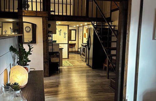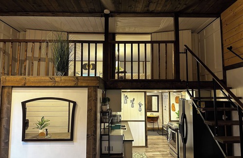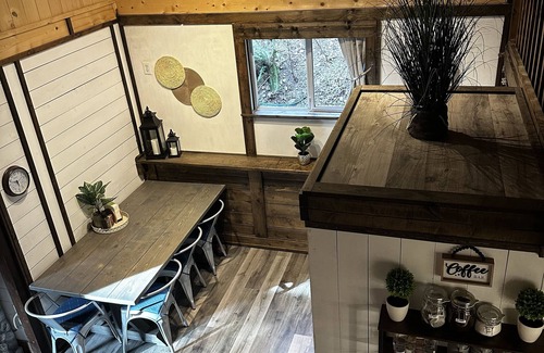 Our 3 bedroom cabin is cozy, private, and unique! Upstairs bedrooms are loft style with 5 foot ceilings. The main floor has a bedroom with a queen bed, full kitchen with everything you need to cook a delicious meal, bathroom with a soaker tub, a cozy living room, and dining space perfect for playing games or just relaxing. An adjoining back room provides extra space for storage or a pet kennel. Outdoor space includes a large front yard with a private fire pit area, picnic table, lots of parking, and the backyard has a ping pong table for your enjoyment. If you are a disc golfer, let us know and we would be glad to play a round with you on our very own 9 hole disc golf course on the property!