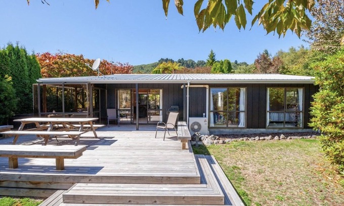 A great bach that accommodates those who are keen on the outdoors, with wonderful walking and biking tracks at the back door. A choice of 3 children's playgrounds, all within easy walking distance. Lake front is an easy 4 minute walk along track.