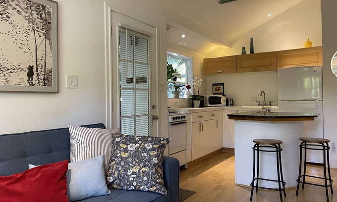 The cottage is located near major hospitals and Facebook HQ..It is designed To host two adults and one child. A private garden walkway leads to a secluded entry . A cozy living area with a convertible sofa and cathedral ceiling.
