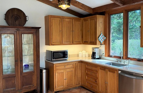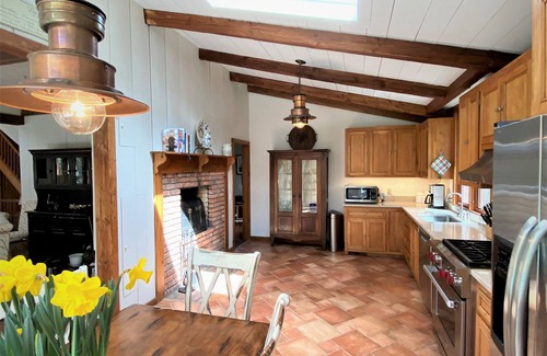 Conveniently located between Amagansett and East Hampton, this cleansed serene two story home is situated on a beautifully lush landscaped acre, just 1.2 miles to the beach. It offers the ultimate in privacy as well as convenient access to all major East Hampton and Amagansett beaches. It's also near terrific restaurants Coche, Nick & Toni's, East Hampton Grill and walking distance to Bostwicks, Moby's, Carissa's Bakery, Smokin' Wolf. This lovely home features a double height ceiling in the living room with custom French doors which open onto the pool deck and offers the ideal area to entertain and relax. A smart 55" Sony flat screen TV with cable, high speed Wifi and Apple TV are available for those times you need to keep in touch with the outer world or watch your favorite movies. There is new two zone Central Heat and Air Conditioning, 4 beautifully furnished bedrooms - two of which are Primary Suites (one offering a King Bed, the other bedroom has a Queen) each with ensuite bathrooms. The 3rd bedroom has a Queen bed, the other a Full bed with a shower bath in between. There are 3.5 renovated bathrooms (some Waterworks features), a cozy library and 3 fireplaces. The spacious eat-in kitchen is a cook's dream and has stainless steel appliances including a Wolf Stove. The gated back yard features a Heated, Saltwater Gunite Pool (Aquabrite Finish) with automatic cover. The pool is trimmed in blue stone and offers an ipe wood deck. There is outdoor dining for (6), lounge chairs (6) and umbrellas. There is a stainless steel Weber Outdoor Grill with Saute, outdoor shower and Full Basement with 2 full size Washer's and Dryers. Beach chairs/umbrellas, 2 bikes, picnic gear are provided.