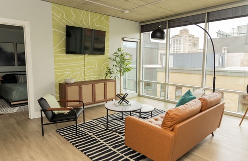 Unique 1-bedroom apartment on a 7th floor, Washer/Dryer, High Speed WiFi, Private Balcony, King Bed, excellent downtown location, satellite and Roku TV, fully stocked kitchen and parking provided 1 block from the apt