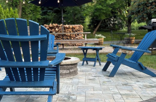 The upstairs patio is adorned with comfortable chairs and tables for convenient outdoor meals. The yard boasts custom Adirondack chairs for leisurely backyard drinks.