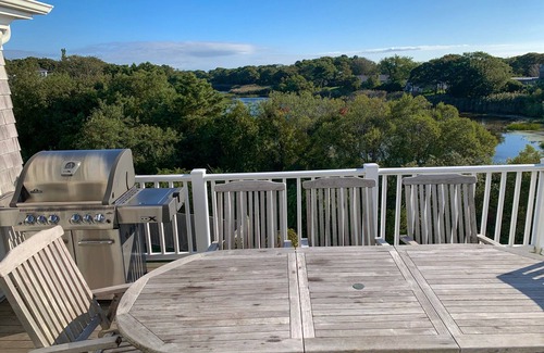 Third floor- large open space great room with vaulted ceilings and lots of windows for stunning panoramic views of Circo Pond, Hyannis Harbor, Great Island, Nantucket Sound, and Hyannis Port towards Kennedy Compound. Sitting area with a 50-inch TV, game table for backgammon/chess/checkers games, and a raised table for family board games. The top deck has large cocktail table and 6 comfortable Adirondack chairs perfect for coffee, cocktails, reading, sunbathing, enjoying sunrises and sunsets.
