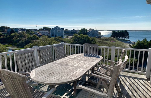 Home boasts picturesque waterfront setting with beautiful views of Nantucket Sound & abutting Circo Pond. Enjoy fabulous decks to soak in gorgeous active views as you watch waves, sailboats, ferries, windsurfers & amazing airborne jumps of kiteboarders. Bird watchers will take pleasure in hearing lovely songs of red winged blackbirds, and spotting great blue herons, egrets, mute Swans, geese, ducks, cormorants, sandpipers, & osprey. Large open floor plan, open kitchen, and comfortable furniture. Spectacular views from nearly every room. This elegant home will provide a seaside dream vacation and wonderful memories.