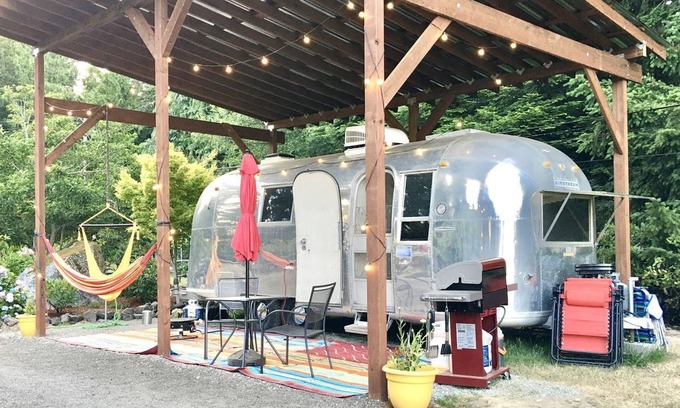 This vintage 1965 Airstream rental in Port Ludlow, with access to a quiet private beach, is ideal for couples looking to experience glamping in Washington. The Airstream features one cozy bedroom, which has two twin beds fitted with bedding and soft furnishings, and a bathroom with a sink, a toilet, and a shower. Other facilities include air conditioning, central heating, and free parking.