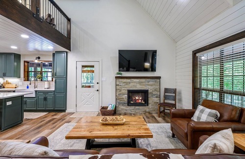 Unwind with loved ones in the inviting living room, complete with a cozy fireplace (seasonal) and enjoy sports or movies on the Roku TV. Comfortable seating ensures everyone can relax after a day at the lake or exploring town. Free Wi-Fi is available throughout the cabin for your convenience. Upstairs, discover a second lounge area with a cozy sectional couch, reading chair, and foosball table for some friendly competition.