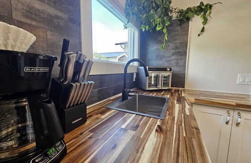 A fully renovated carriage home offers a peaceful Kelowna escape. Inside you’ll find a very comfortable queen size bed, a pull out couch for any littles and a modern fully furnished kitchen.