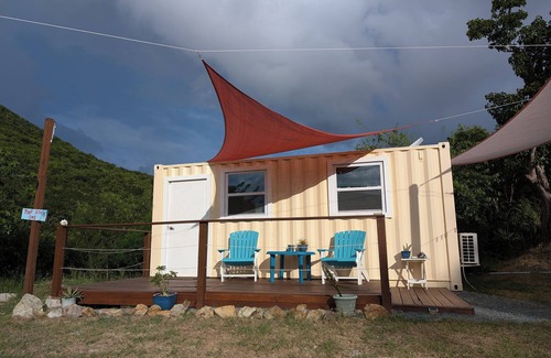 Our new and improved campsites have been upgraded to air conditioned container rooms! A queen matress with fresh linens and towels are ready for your stay. A TV, recessed lighting, air conditioning and small fan are also newly added to our sites. We have installed large decks with railings in front of each container room which also have two adirondack chairs and table. The conainer rooms are new this season, so all reviews prior to August 1st 2024 are from the previous nylon tents.