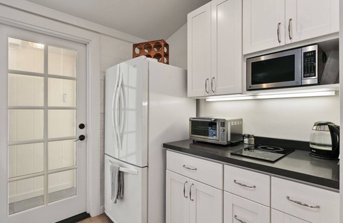 Relax and unwind in this fully restored and updated 1940’s beach cottage just two blocks east of historic highway 101. We’ve tried to think of all the little details that make for a perfect stay from the super quiet Fujitsu heating and cooling unit, to a six port USB charging station for your electronics, a blue tooth speaker, and quality hangers in the two closets. You will appreciate the California king bed, two luggage racks, ceiling fans, armoire, sectional sofa, 55 inch Roku TV in the great room and and Samsung TV in the bedroom. Access your Netflix and other subscription services. The kitchen has a 13.9 CF refrigerator/freezer with ice maker, a two burner induction cook-top, compact dishwasher, deep stainless steel sink, toaster oven with convection bake, a microwave, and a coffee maker. You’re an easy 10-20 minute walk to top notch coffee houses, the great shopping, and fantastic dining in historic Encinitas. Enchanting Moonlight Beach is close as well and we provide the beach chairs, umbrella, towels, cooler and a wagon to haul it all. Come home to an outdoor shower to remove the sand and salt. Bring your tennis or pickleball rackets as there are public courts 1 minute away.