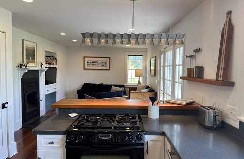 The first floor is very well laid out with the kitchen and living room open to one another with access to the blue stone patio overlooking the private pond. There is a separate dining room with a stunning handmade cherrywood table, and classic details like beadboard wainscotting make this house feel timeless. The living room boasts more custom furniture made by the owner and a smart TV for movie nights. Down the hallway, you will find a full bathroom that looks like its straight out of restoration hardware and the first-floor bedroom. The bedroom has French doors leading to the "moon garden" and the large blue stone patio. The name moon garden was coined because all the flowers and plants in this area are white, it is absolutely beautiful.