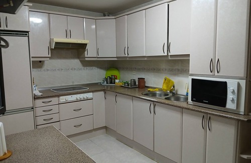 Full kitchen ready to make your meals with ceramic hob, refrigerator, microwave, kitchenware such as cutlery, plates, cups, glasses, glasses, napkins, tablecloths, spices, etc.