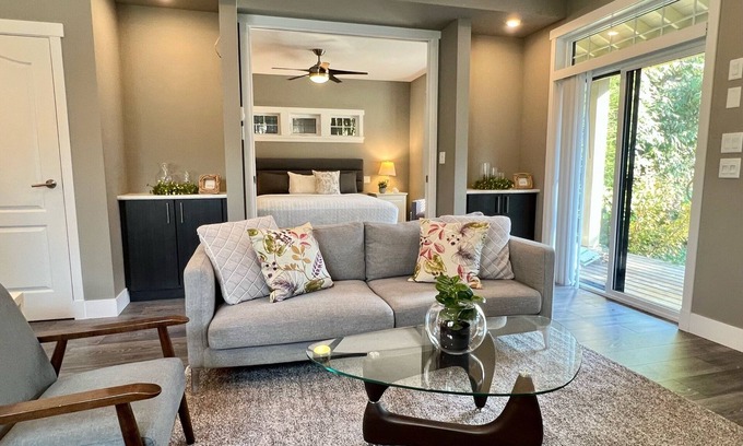 Look no further than our guesthouse! Enjoy your own spacious building with plenty of parking and patio space. The location is perfect for a brew crawl, with Moody Centre Skytrain, Brewers Row, and restaurants just a 5-minute drive away. Plus, outdoor enthusiasts will love the easy 20-minute drive to Bunzten Lake and Sasamat Lake. Full kitchen, 1 king bed, 1 queen bed, and a full bath, as well as a large living space perfect for unwinding. Please note, no parties or large gatherings are allowed.