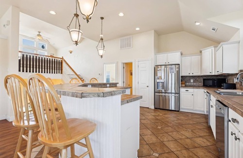 Top Level: This level offers a beautiful king master suite with a new bedroom set, a jetted tub, a sliding door to the sundeck, and a TV. The grand great room is also on the top level with a new sectional sofa, a gas fireplace, and a large screen TV/Blu-ray DVD, as well as a chef's dream kitchen with two dishwashers, a kitchen island with seating for six, and a dining table for 12! Enjoy a good book or a nap in the Captain's watch/loft area.