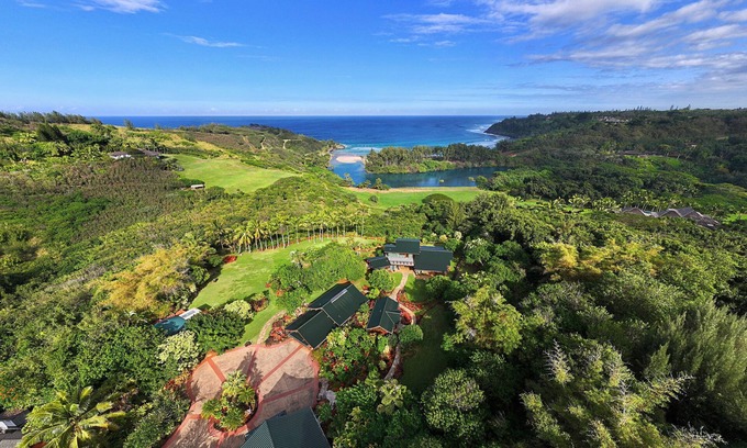 Perched on a stunning ocean bluff, this 12-acre estate offers breathtaking views of the ocean, mountains, and Kilauea River. Surrounded by lush tropical gardens, the home showcases fine craftsmanship with rich woods, custom stone, and vibrant accents inspired by nature. Expansive windows and teak doors frame the scenery, while a private path leads to a secluded beach where serenity and beauty converge.