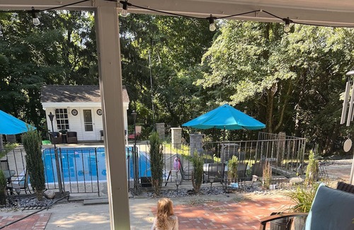 Private 4-Bedroom Home in Residential, 1950’s Executive-Style Neighborhood. This home was inspired by and featured in a 1950’s Better Homes Magazine. Main Living Space is an Open Floor Plan, including Living Room with Wood-burning Fireplace, Dining Room with expandable table (seats 6-can add 2), Modern Kitchen with Bar-Height Island (seats 6). Living Room Glass Doors open to Back Porch overlooking Large Brick in-lay / Concrete Patio with Inground Pool, Pool House with Changing Rooms and Toilet. (Pool is not heated-It’s covered w/solar thermal for Sun Warmth). Large Fully Fenced Backyard with Wooded Backdrop offering Seclusion and Privacy. Electric & Wood Fire-pits, Barbeque Grill. Outdoor Lighting, Pool seating. Pool Open May 1st-Sept 30th, some weekly maintenance needed. Pet Friendly with additional fee (s). Located 10 minutes to Major Shopping, Highways, Colleges and Hospitals. Close to Beacon, Poughkeepsie, Rhinebeck, an hour to the Catskills, and approx 90mins from NYC.