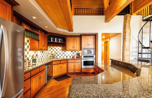 Kitchen: Fully equipped gourmet kitchen space featuring high-end stainless steel appliances, including double ovens. There's seating for four at the convenient kitchen bar with granite countertops.