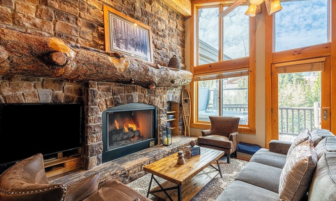 Living Room: Enjoy plenty of mountain contemporary furnishings, a cozy gas fireplace with a soaring stone front, a 55” 4K UHD Samsung Smart TV with Apple TV and Blu-Ray streaming services and devices. You will also enjoy lots of views and natural light from the many windows.