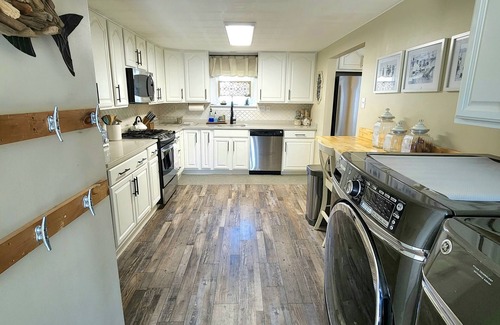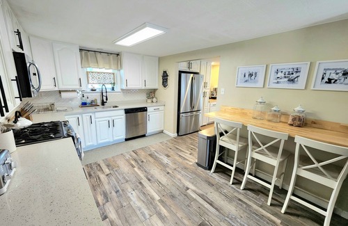 The Schooner Villa by the Bay is a newly remodeled Solar-Powered 3 bedroom just minutes from the bay & heart of Cape May. The Villa offers 4 tv's, an open concept living room, coffee bar, washer + dryer, fully equipped kitchen, beautiful modern beach decor, and all linens are provided.