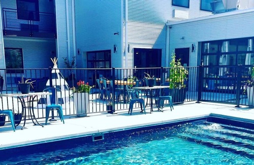 10,000 sq foot boutique hotel. 15 rooms that can accommodate 80 overnight. Event room, patio, pool, disc golf. Have the entire place privately for your own event.