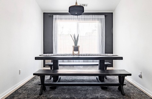 Recently renovated 2,200 square foot single story home that feels just like home. Main house and spacious guest house with a gym. We have bedrooms that sleeps 10 comfortably in our split floor plan house. On one side we offer two bedrooms, full beds, and 1 queen with shared bath, and a Laundry room for anyone that needs it. On the other side we offer the Master with a huge ceiling tv with free streaming services that has large sliders to patio, with an attached bath that features a bidet, and a walk-in-closet. Next we have a guest house that offers a master bedroom with a California king bed, a separate seating area, a separate kitchen and coffee maker and a bathroom. Room can also be used as a separate work space. We have a custom kitchen newly renovated with all new appliances and ready to make just about any meal. We have 3 bar stools, and 4 chairs plus a high chair for the kiddos. We have a separate cabinet in kitchen full of games to be played while enjoying your stay. Our living room includes electric reclining couch that seats your whole group. and the optional movie theater option with our 75” tv that includes free streaming services to anyone with an Apple Iphone. We have a dynamic outdoor living space surrounded by palm trees, string lights, 2 swing chairs, beautiful patio set, a grill, and corn hole. Around the corner we also have a huge play set for kids to play on and a seating area for the parents to watch. [not photographed]. Along with a gym, weights, treadmill and large mirrors, we also have an EV plug for free car charging. Come stay at our home that offers everything you could possibly need and more.
