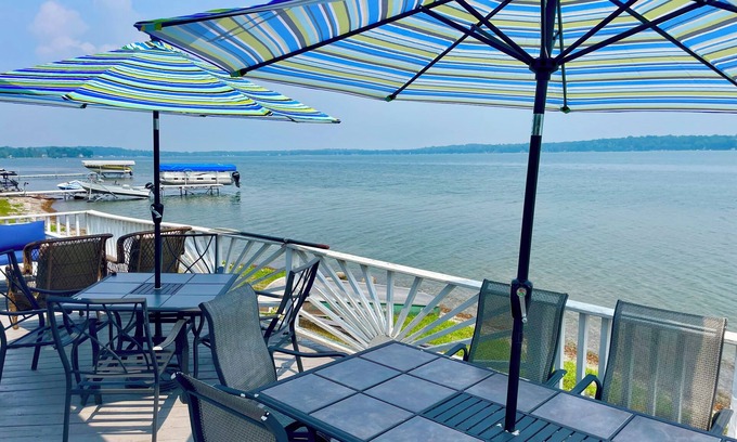 Central air is key for sleeping on those sultry summer nights. Many folks enjoy sitting on the porch at night with the windows open (have screens) and listening to the relaxing sounds of the water. If you like daytime water activities, it is only about 3 feet deep near the end of the dock and just gradually gets deeper further out. It's a great spot for kids and adults alike. Weeds are scarce in this part of the lake, which results in a much more enjoyable swim! The large deck has comfortable seating with a table and some lounge furniture along with a gas grill. If you don't have a boat, one can be rented at one of the three different nearby marinas and kept at the dock. Two kayaks are kept in the garage for you to use along with life jackets as well. There is also a campfire pit located at the edge of the lawn/beach for roasting marsh mellows with the family!