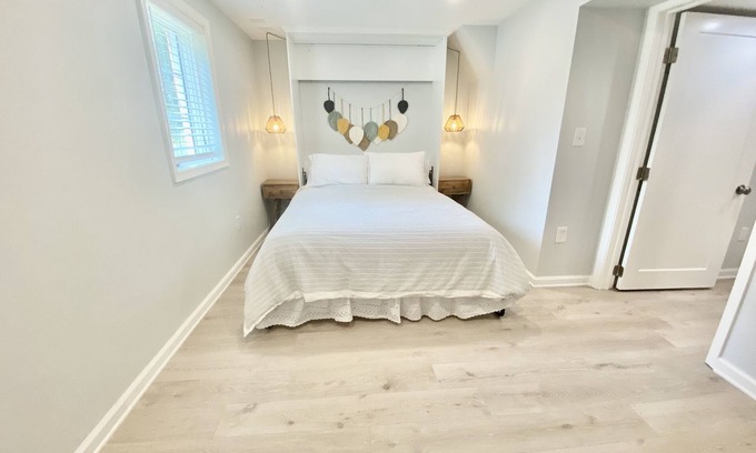 Need a central home away from home for 30 days or more? Completely independent light-filled basement apartment of a single family home in a nice neighborhood. Enjoy your own private entrance, private full-size laundry machines, stylish living & dining space, kitchenette, queen bedroom & full bathroom with soaker tub, & a bonus room/office. The kitchenette has a full refrigerator, microwave, dishwasher, countertop oven & air fryer and counter cooktop.