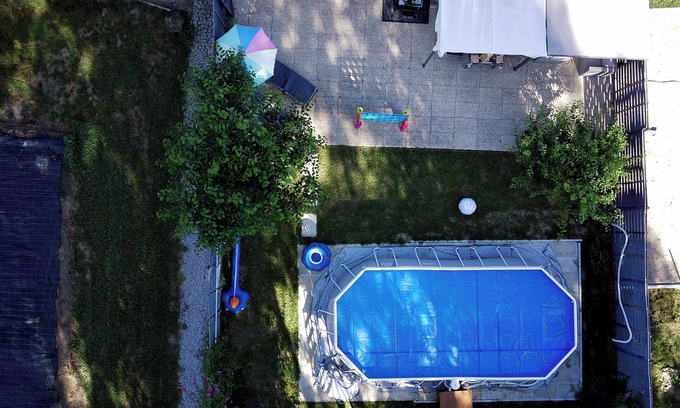 It is solar heated which is very comfortable to enter and always warm through your families fun and play. The pool size is 6X3meters, and there are a good number of pool toys for both children and adults to have fun with.