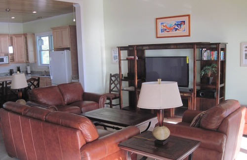 The living area has leather sofa, love seat and chair with ottoman. A 52” Flat Screen Smart TV, DVD player, IPod doc and surround sound. Games, Movies, Music provided, Books and Cookbooks.