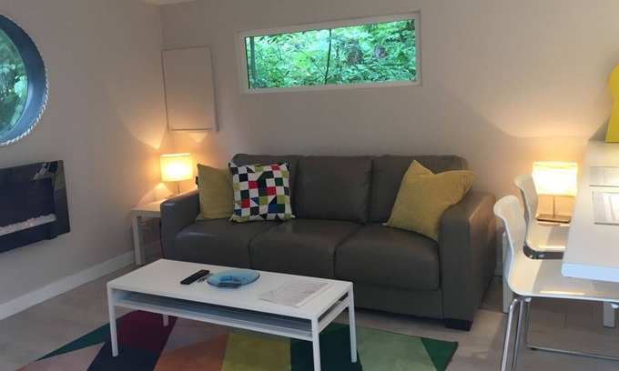 You have a cozy living room with a comfortable leather queen sofa bad, perfect for children or guests. There is a fireplace and even a round portal window. Relax and watch Netflix and enjoy unlimited programming with Apple TV. You have free wireless internet and private parking.