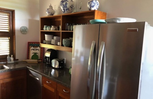 Two bedrooms are each situated on each side of the main living area. The open kitchen equipped with new appliances, and ample dishware and kitchen accessories. The quiet neighborhood is just minutes from some of the best restaurants, the sea, and watersports center at Oualie Beach.