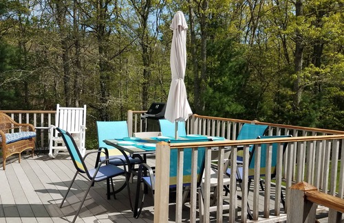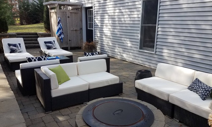 OUTDOOR AREAS: our house is at the end of a short, private road - surrounded by trees. Half the road is paved & half is gravel. The expansive side patio has a fire pit, outdoor shower, and comfy lounge chairs. The deck overlooking the backyard is a perfect place for outdoor dining & sunning - or enjoy reading on the rocking chairs on the front porch.